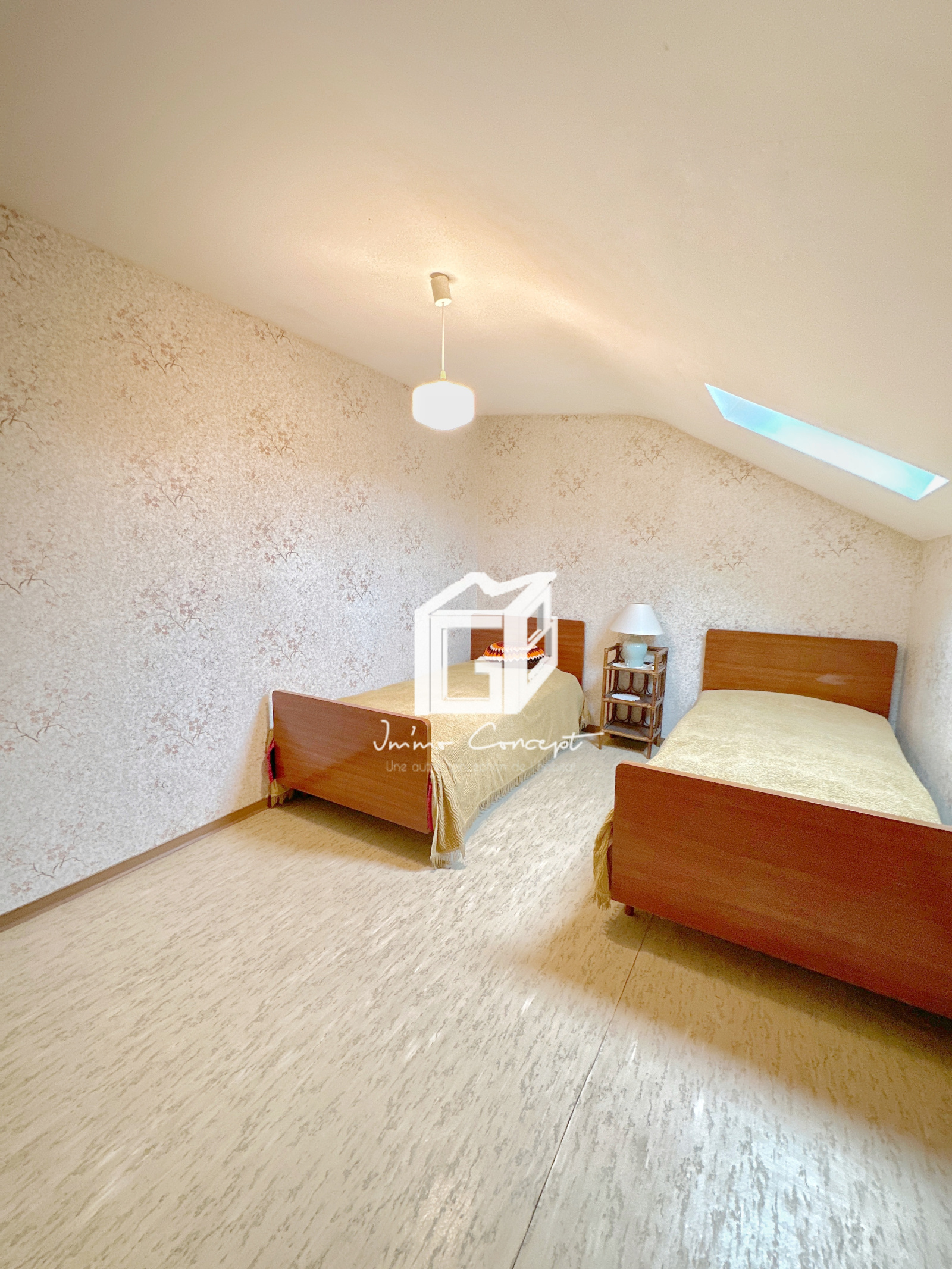 À l’étage, vous trouverez trois chambres, une salle de bains, une pièce actuellement aménagée en salon-séjour, ainsi qu’une cuisine.